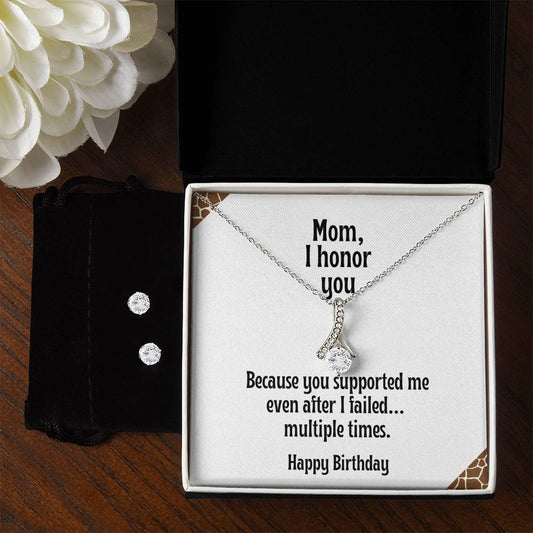 Alluring Beauty Necklace and CZ earrings bundle for Mom | Ribbon Pendant | Because you supported me | Happy Birthday